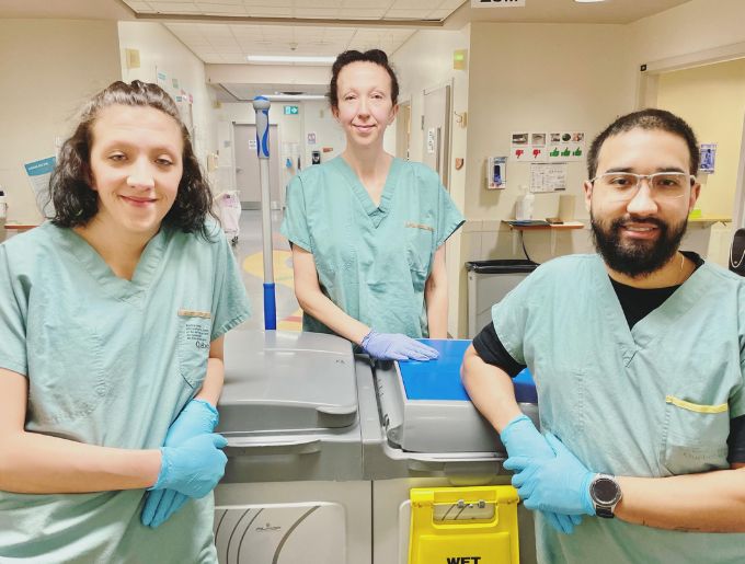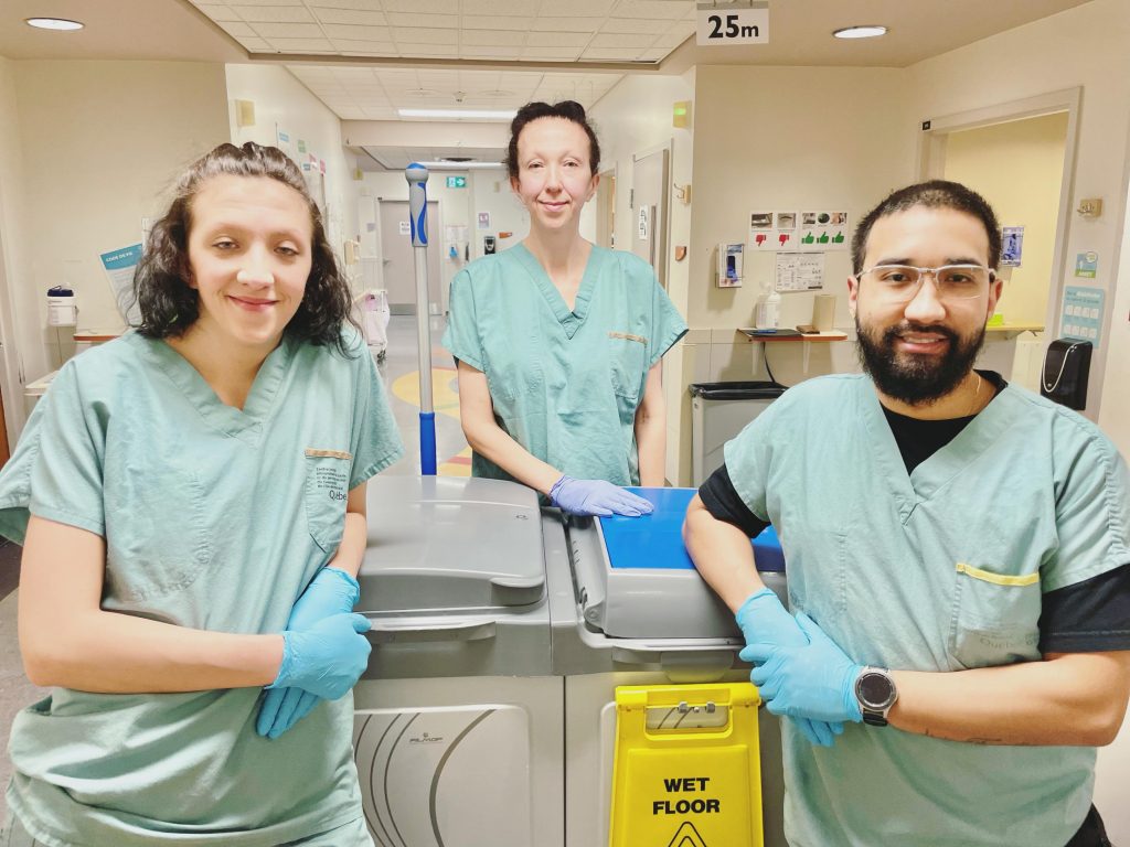 Fanny Dupré, Véronique Ouellette et Cristian Emmanuel Vasquez de Gracia, préposé.e.s à l’entretien ménager à l’Institut de réadaptation Gingras-Lindsay-de-Montréal (IRGLM)