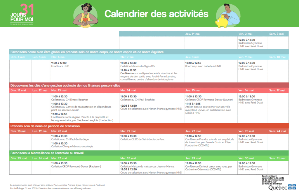 Du 1er au 31 mai 2025, l’équipe Santé et Mieux-être du CCSMTL vous invite à participer à la 4eédition de «31 jours pour moi : en santé de la tête aux pieds». Cet événement incontournable a pour objectif de promouvoir les saines habitudes de vie tout en renforçant la culture du « prendre soin » au sein de notre organisation.