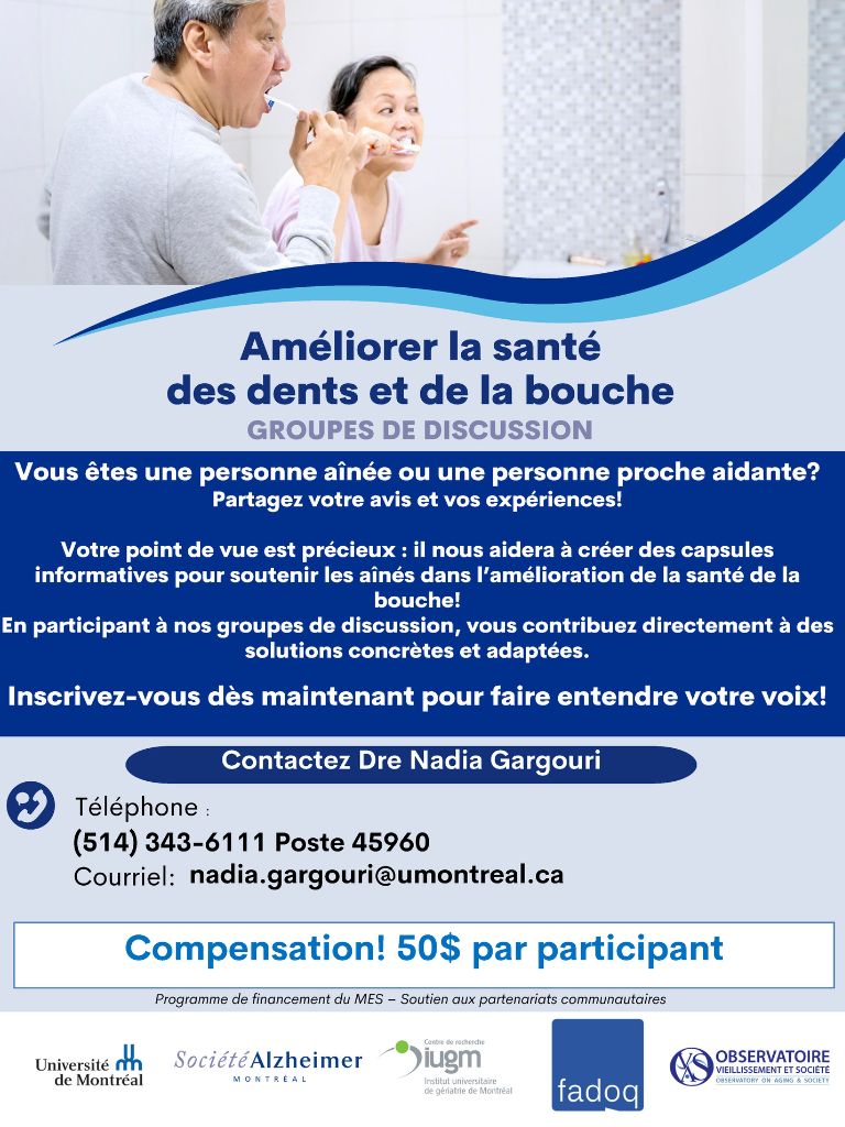 Si vous avez plus de 65 ans ou êtes proche aidant ou aidante d’une personne aînée, n’hésitez pas à participer à ces groupes de discussion pour faire entendre votre voix et contribuer à l’amélioration de la santé buccodentaire!
